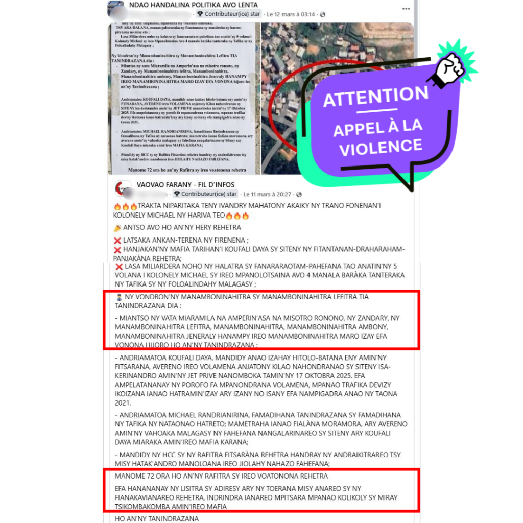 - Les appels à la violence, les menaces et les incitations à des actions extraconstitutionnelles sont interdits par la législation malgache, notamment par l’article 26 du Code de la Communication médiatisée. Les auteurs et relais de ces contenus s’exposent à des sanctions pénales.