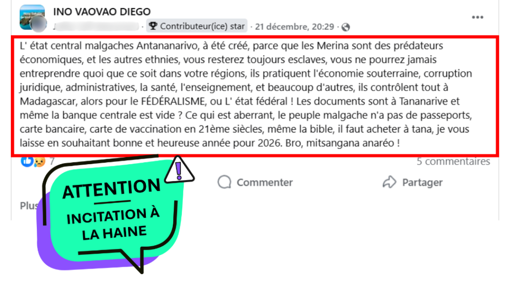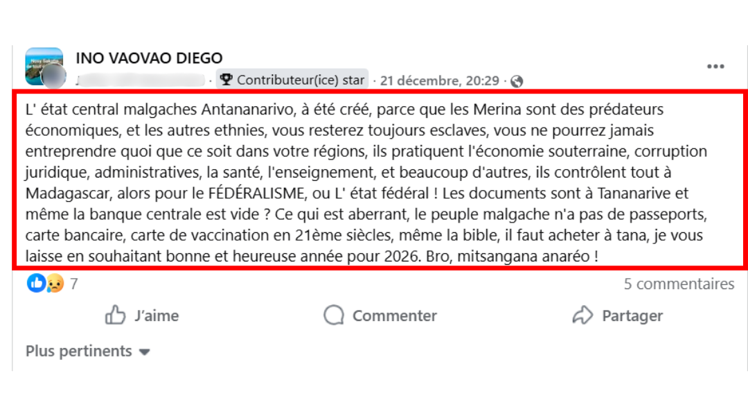 Contexte : Publication recensée dans un groupe de discussion public à large audience sur Facebook, le 21 décembre 2025. Les propos s’inscrivent dans un contexte de revendications en ligne en faveur de l’instauration d’un État fédéral à Madagascar. Pour étayer cette position, l’auteur mobilise un discours fondé sur des oppositions ethniques, accusant la communauté Merina de domination politique et économique à travers le contrôle de l’État central.