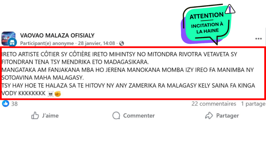 - Les propos incitant à la haine ethnique ou raciale constituent une infraction sanctionnée par le droit malgache, notamment par l’article 26 du Code de la Communication Médiatisée, et les auteurs ou relais de tels messages s’exposent à des sanctions ; les internautes sont encouragés à exercer une vigilance citoyenne en ne relayant pas ces contenus et en signalant toute publication à caractère discriminatoire afin de limiter leur diffusion tout en respectant la liberté d’expression.