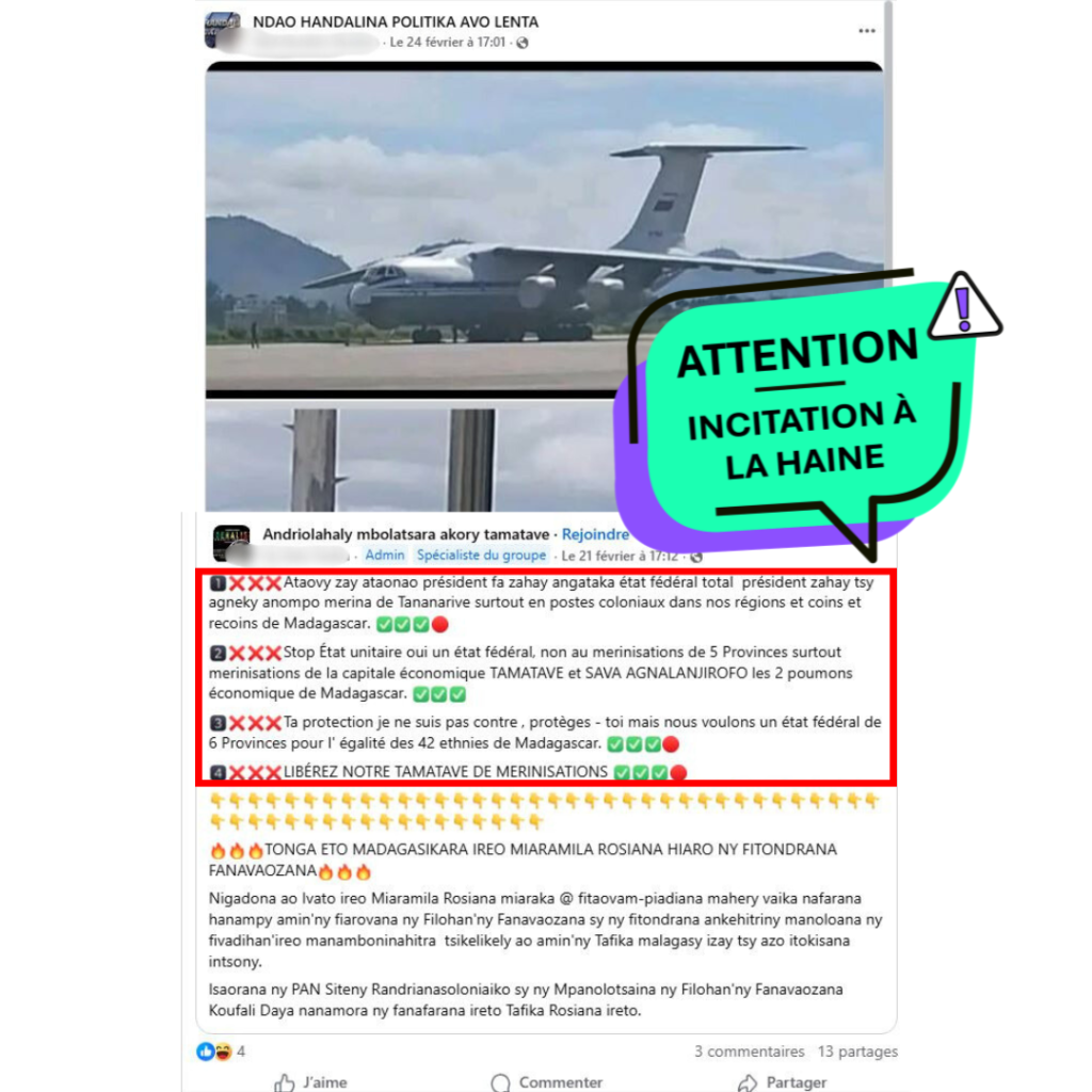 Typologie de discours : Le discours analysé relève d’une incitation à la haine fondée sur l’identité ethnique. Il oppose les populations dites « côtières » à celles issues de l’ethnie Merina. Ces derniers étant présentés comme dominant les institutions et certains territoires à travers une supposée « merinisation ». Cette rhétorique contribue à alimenter une opposition entre groupes ethniques et à renforcer les tensions identitaires.