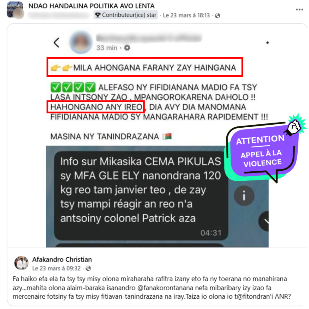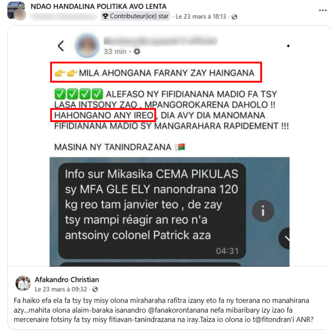 Contexte : Publication recensée le 23 mars 2026 dans le groupe de discussion public à large audience sur Facebook, NDAO HANDALINA POLITIKA AVO LENTA, comptant environ 75 000 membres. Les propos s’inscrivent dans un contexte d’échanges en ligne marqués par une forte circulation de contenus à caractère polémique, où certaines prises de position visent à discréditer des acteurs publics plutôt qu’à engager un débat sur le fond.