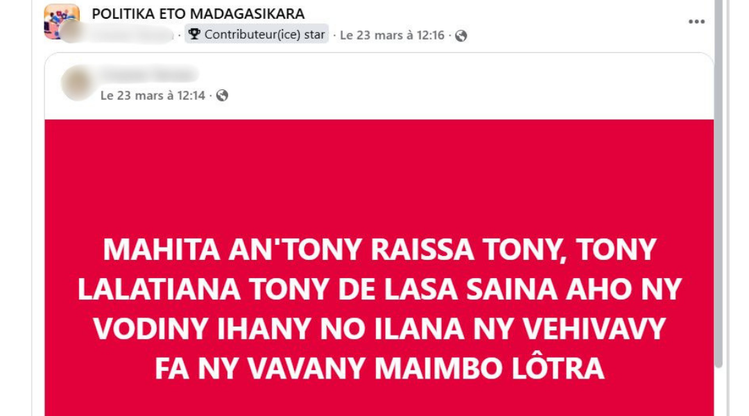 Contexte : Publication recensée le 23 mars 2026 dans un groupe de discussion public à forte audience sur Facebook. Les propos s’inscrivent dans un contexte de forte polarisation politique, au cours duquel les noms des deux personnalités ont alimenté les débats en raison de leur rôle respectif. Dans ce climat, certaines prises de parole s’écartent du débat d’idées pour cibler directement les individus à travers des attaques personnelles et sexistes.