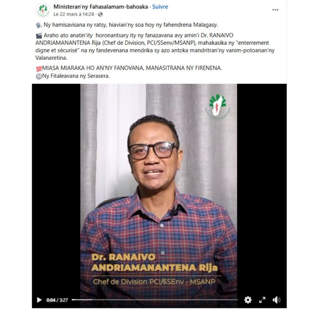 Dans une vidéo publiée à la date du 22 mars 2026, le ministère de la Santé publique explique le protocole mis en pour avoir un enterrement digne et sécurisé que chaque famille endeuillée doit observer scrupuleusement