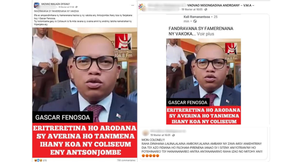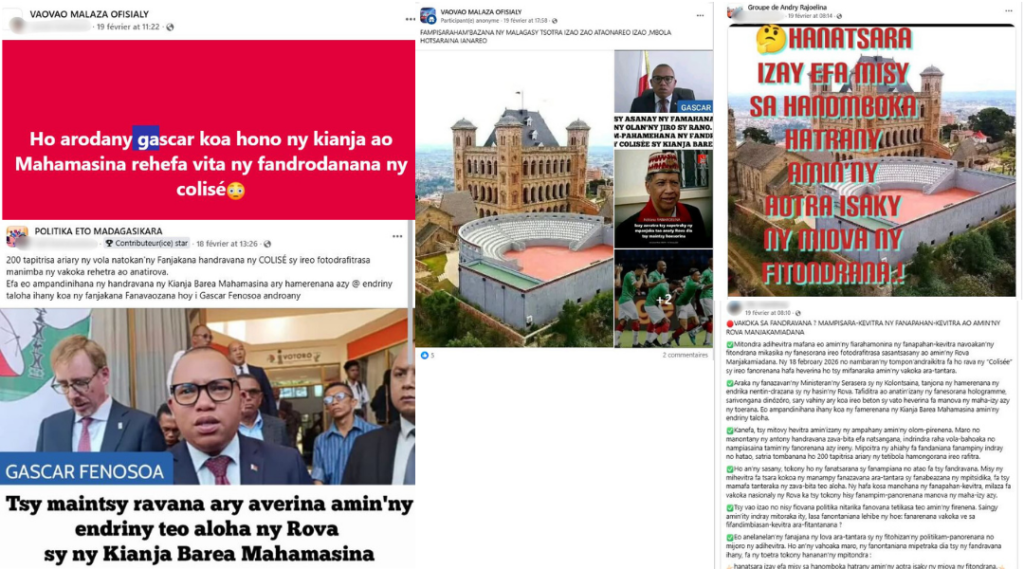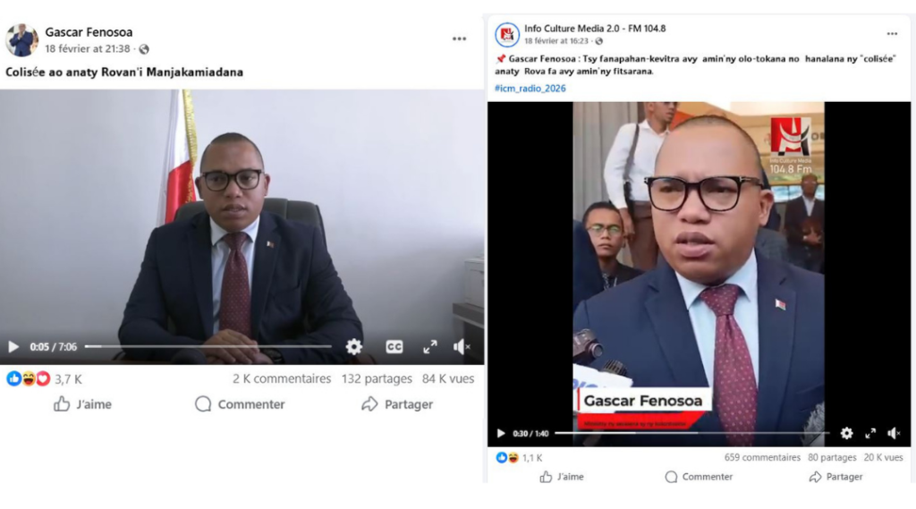 Toujours le 19 février 2026, des contenus ont circulé attribuant à Gascar Fenosoa des déclarations concernant le Coliséum d’Antsonjombe. Selon ces publications, le ministre aurait affirmé que cette infrastructure ne correspondrait pas à la culture malgache et qu’elle devrait être démolie afin de restaurer l’aspect initial du site. Ces affirmations circulent accompagnées d’images présentant des citations attribuées au ministre, suggérant qu’un projet similaire à celui du Rova Manjakamiadana pourrait également concerner Antsonjombe.