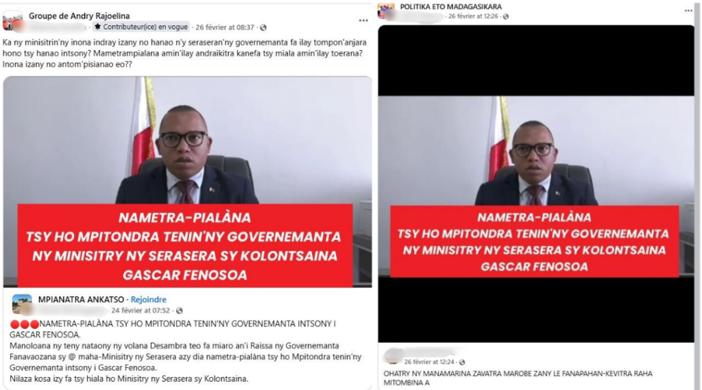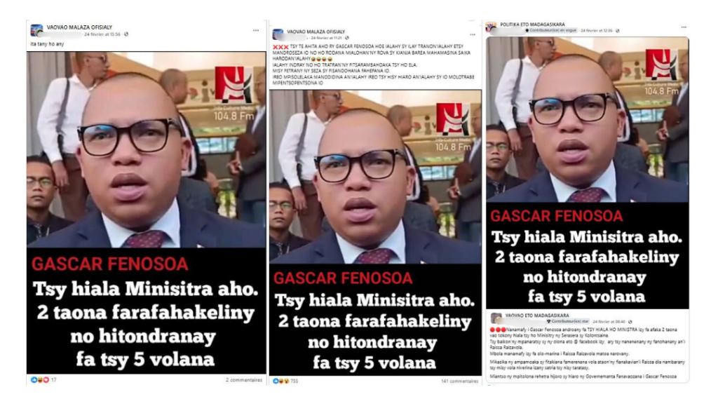 Entre le 18 et le 26 février 2026, une série de publications attribuant différents propos polémiques au ministre de la Communication et de la Culture, Gascar Fenosoa, ont circulé sur Facebook. Ces publications reprennent des images de ses interventions médiatiques auxquelles sont associées différentes citations. Les propos qui lui sont attribués évoquent notamment une éventuelle démolition de certaines infrastructures, son intention de rester au poste de ministre pendant au moins deux ans, ou encore sa prétendue démission de son rôle de porte-parole du gouvernement.