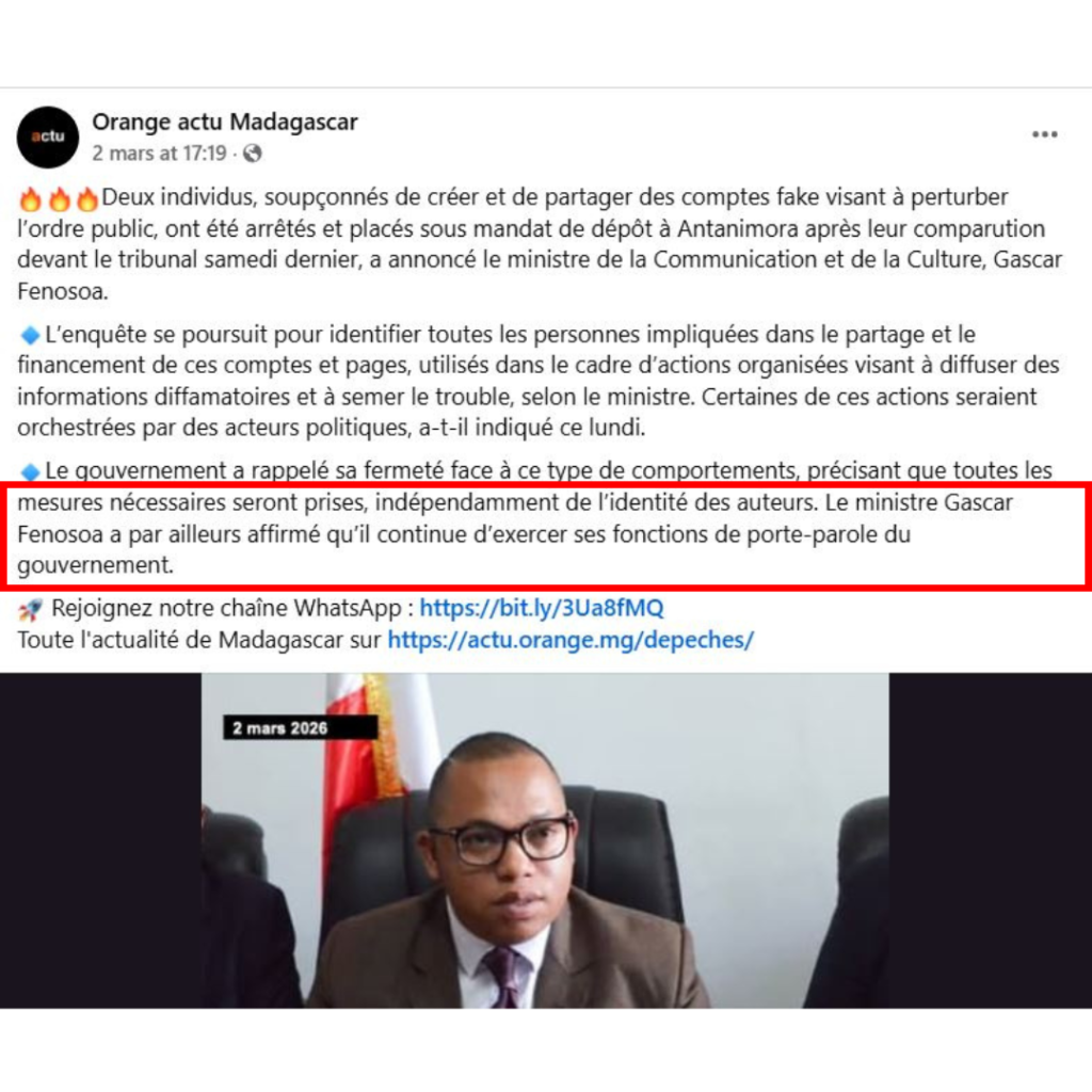 Par ailleurs, des publications virales affirment que Gascar Fenosoa aurait quitté ses fonctions de porte-parole du gouvernement tout en restant ministre de la Communication et de la Culture. Lors d’une conférence de presse tenue le 2 mars 2026, le ministre a démenti ces affirmations. Il a indiqué qu’il demeure le porte-parole du gouvernement, rappelant que cette responsabilité lui a été officiellement confiée et qu’aucune décision ne l’a relevé de cette fonction. Au cours de cette intervention, Gascar Fenosoa a également évoqué la circulation d’informations trompeuses sur les réseaux sociaux, indiquant que des vérifications sont engagées afin d’identifier l’origine de certains contenus diffusant ces rumeurs. Ces déclarations ont notamment été rapportées par Orange Actu Madagascar, qui confirme que le ministre affirme toujours exercer ses fonctions de porte-parole du gouvernement.