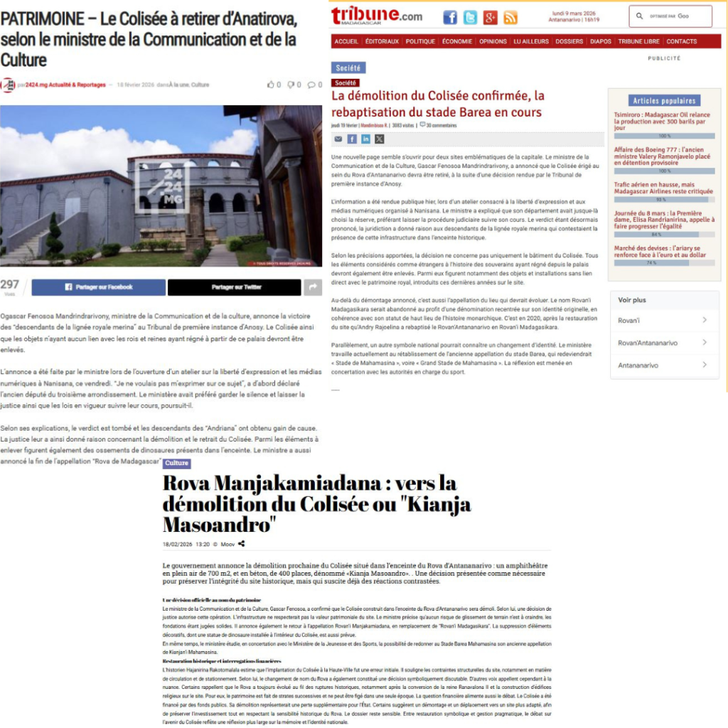 Après recoupement des contenus publiés, il apparaît que le ministre a annoncé que le Tribunal de première instance d’Anosy avait rendu un verdict en faveur des descendants de la lignée royale merina contestant la présence du Colisée sur le site historique. Il a expliqué que la présence de cette infrastructure était perçue comme une désacralisation du site. Le ministre a confirmé que le Colisée situé dans l’enceinte du Rova Manjakamiadana sera démoli.
