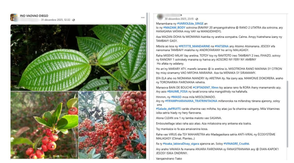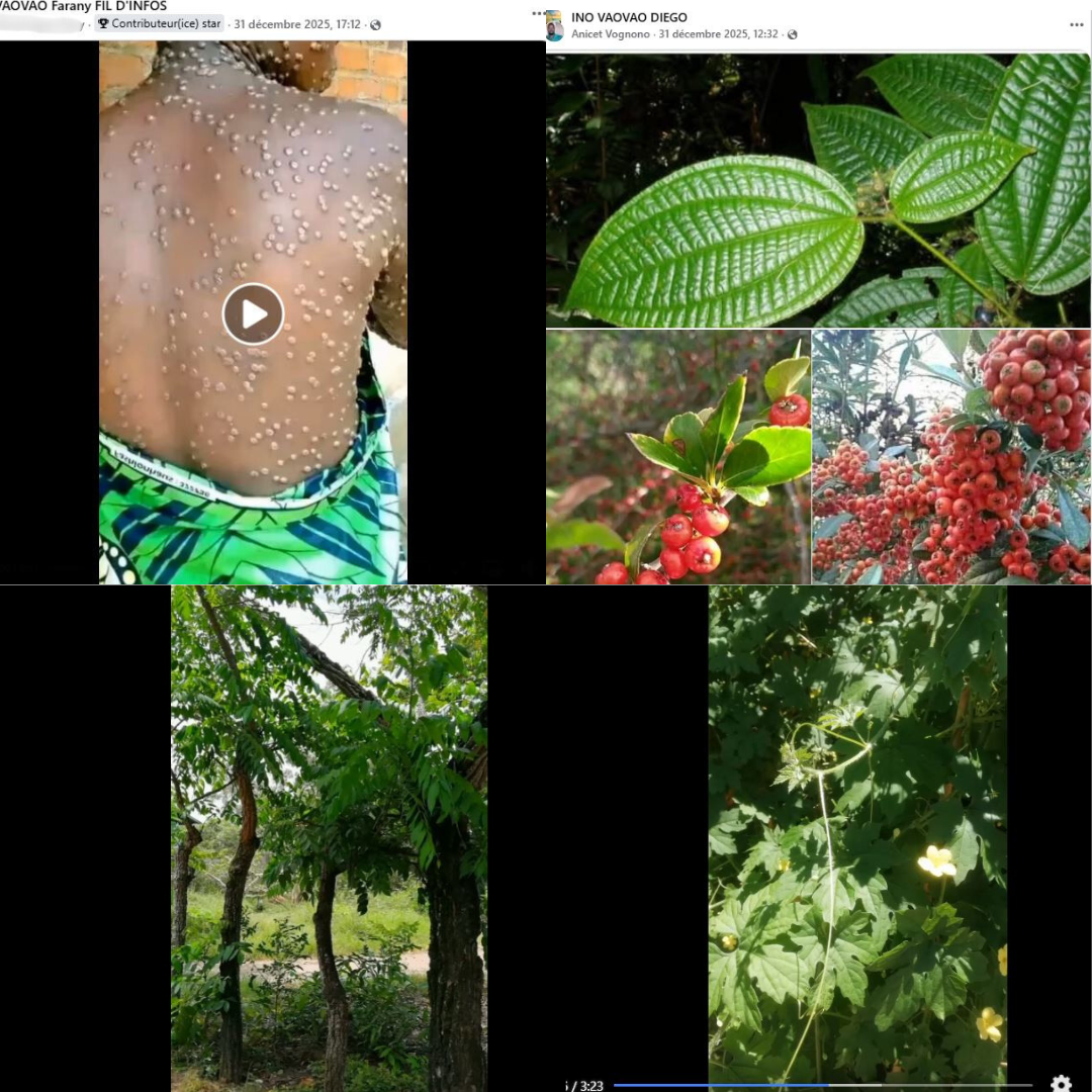 Le 31 décembre 2025, un membre du groupe de discussion public sur Facebook INO VAOVAO DIEGO, qui compte près de 160000 membres, a posté une publication affirmant que des plantes médicinales pourraient guérir la variole du singe (Mpox). Cette publication a également été relayée dans d’autres groupes de discussions tels que VAOVAO Farany FIL D’INFOS, ou encore NDAO HANDALINA POLITIKA AVO LENTA, cumulant des milliers de réactions, de commentaires et de partages.