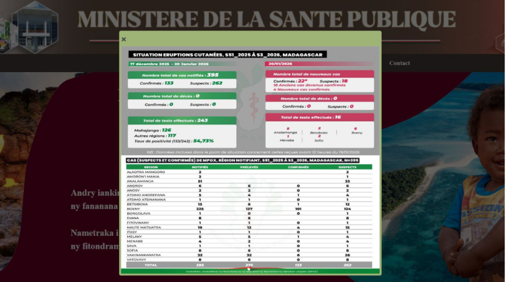 Selon les informations communiquées par les autorités sanitaires, les premiers cas de Mpox à Madagascar ont été détectés fin décembre 2025 à Mahajanga, région Boeny. Les analyses biologiques ont été réalisées par le Laboratoire d’Analyses Médicales Malagasy (LA2M) et l’Institut Pasteur de Madagascar (IPM).
